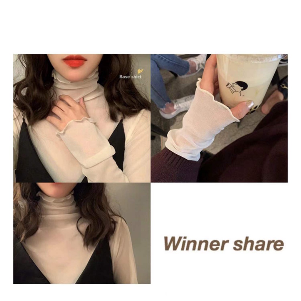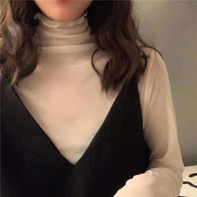 ☁️Inner wear king skin-transparent base top new ins retro high collar skin-friendly inner wear mesh top fairy long sleeve lace base shirt female girls top Korean INS style