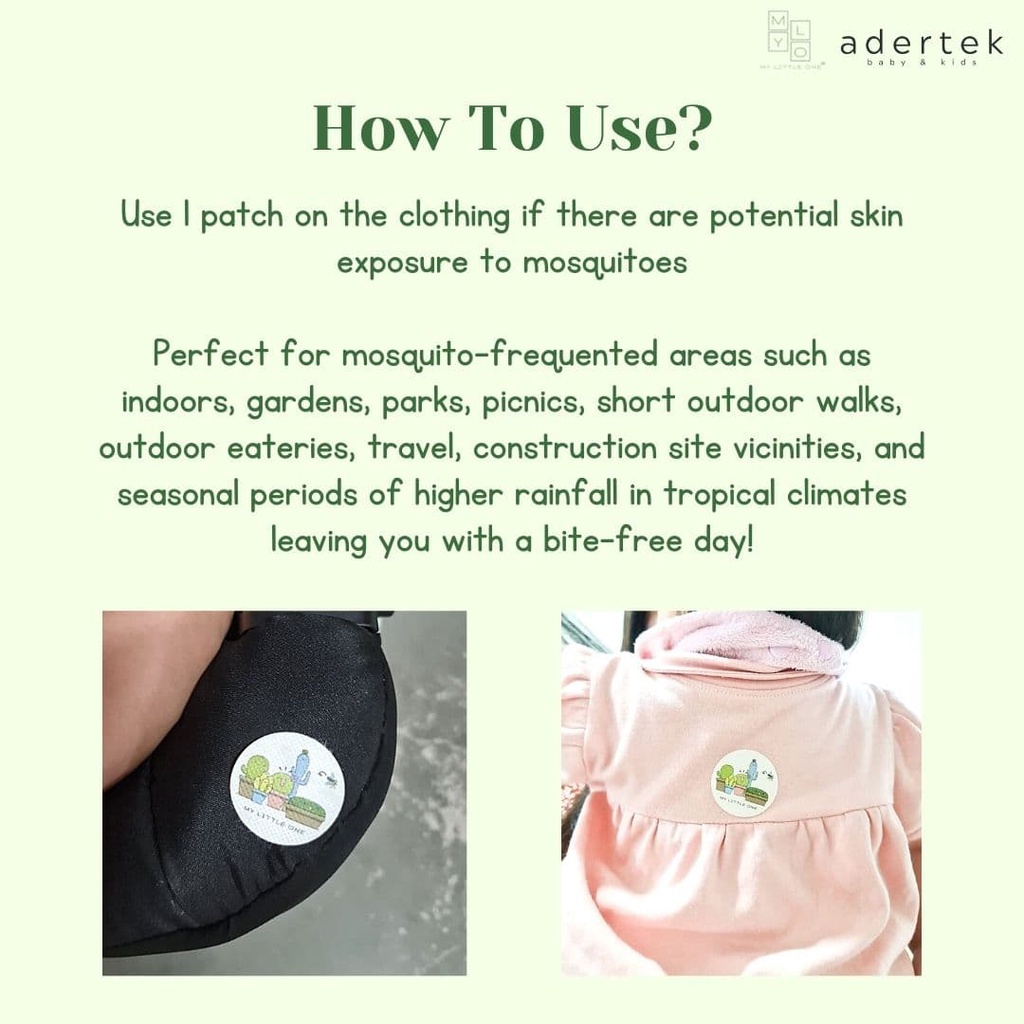 Effectiveness:No more mosquitoe bites Fragrance:Last more than 12 hours Love this MYLO mozzie patch over others. Lasting fragrance that is not too overpowering yet effective. Sticker does not leave a stain on clothings.