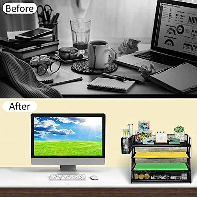【Super Large Capacity】4 tier desk organizers and storage is ideal for your office, it has enough storage space for all your office desk supplies can sort your files, paper, which is very convenient for you to find the files you need. This paper letter tray design hanging pencil holder (with built-in hooks) has two to organize all your pens and pencils, the sliding drawer can be placed at will and provides great space for your desktop.