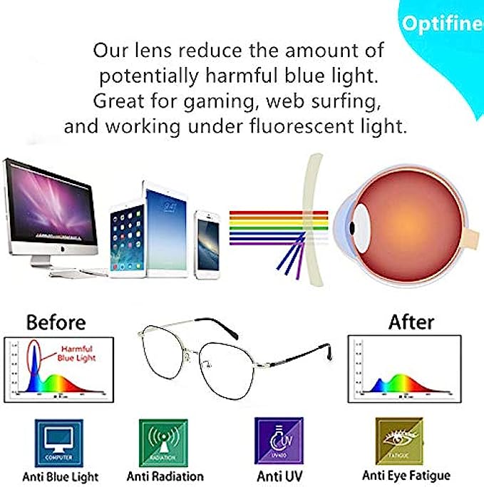 ? ANTI BLUE LIGHT -- Staring at a computer screen all day can cause headache and nausea, Optifine Glasses will block 97% hurmful blue rays out, to minimize Digital Eye Strain caused by harmful blue light emitted from digital screens