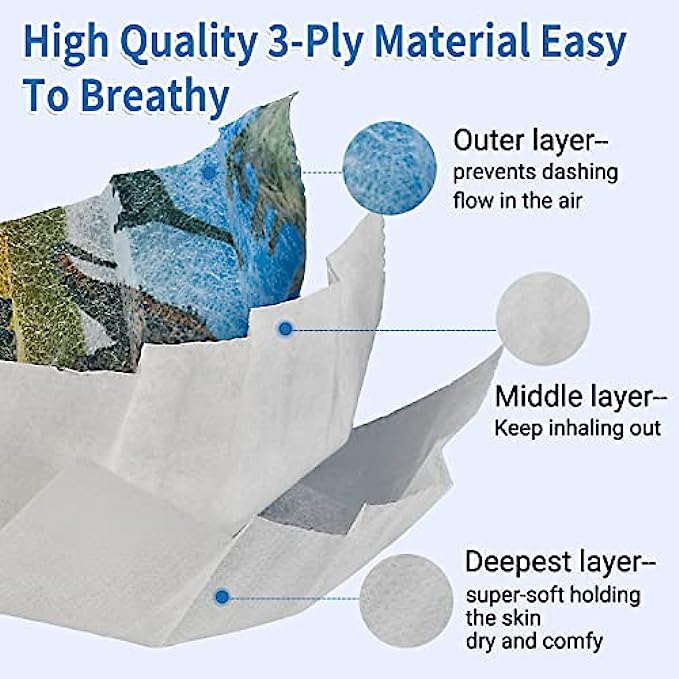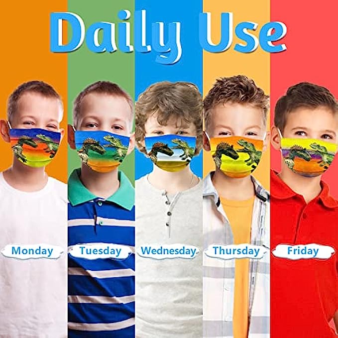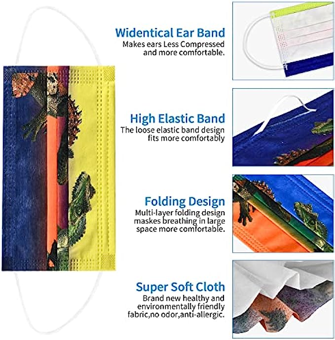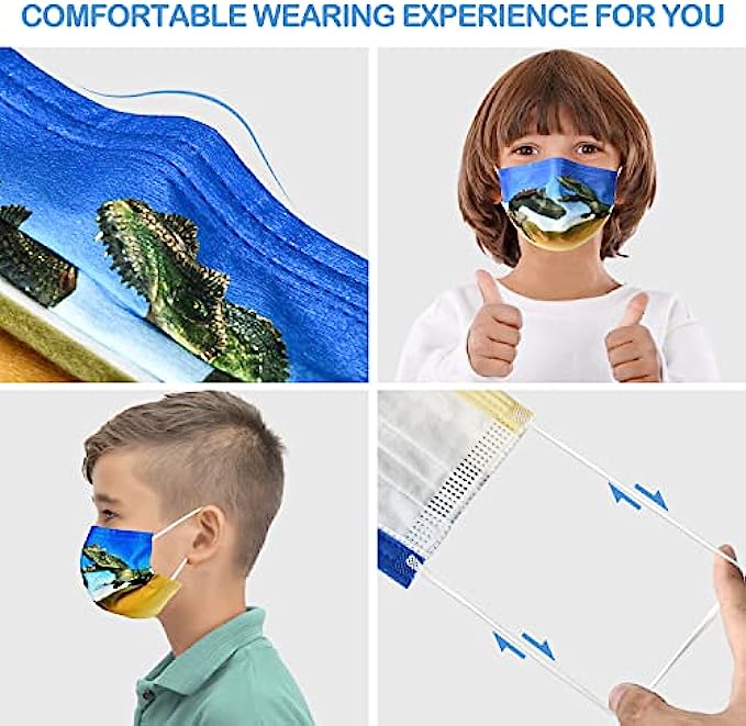 • 【3 Protective Layers】- Our dinosaurs disposable kids face mask is sized at 5.9inches x 3.9inches with 3 Ply layers , The Outer color layer is a water-resistant layer, say goodbye to splashing liquid; Middle layer is a filtering layer, say bye to particles from 0.3 to 1.0 pm. Inner layer is a water absorbing layer, which can absorb the moisture from the breath of the wearer, avoid the filtering layer from getting wet.
