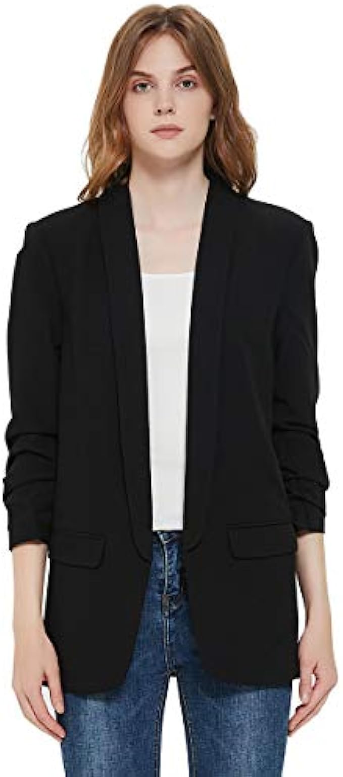 Charis Allure Womens 3/4 Ruched Sleeve Blazer Jacket Lightweight Work Office Open Front Solid Coat, Black