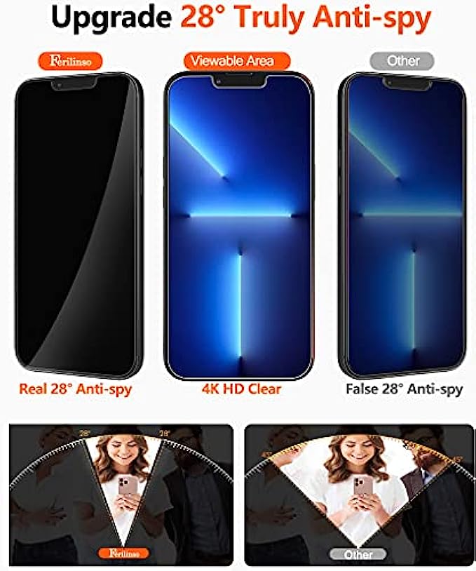 True 28° Privacy Protection: Ferilinso Privacy Coatings made of new materials from germany, have better Privacy performance than other materials. the screen is only visible to persons directly in front of the iPhone 13 Pro Max 6.7 inch screen and does not affect power. Keeps your personal, private, and sensitive information hidden from strangers, Provides the most powerful protection, even your friends or colleagues sitting next to you also can't see on your messages. Shatterproof and Scratch-Resistant: Ferilinso Privacy Glass made of 9H super strong military explosion-proof glass, and the strengthened edge design ensure the corners of the screen are protected well. which not only shock-proof, also protecting your screen from scratches to high impact drops. The phone is placed in the bag without worrying about being scratched by sharp objects such as keys. Frontal 99.99% HD & Sensitive Touch: Ferilinso Privacy Glass screen protector break through the defects of the blurred picture of the privacy glass films on the market, highly restore the best visual feast brought by the iPhone screen. 0.33mm ultra-thin tempered glass maintains excellent responsiveness sensitivity touch make you feel nothing on screen. Hydrophobic and oleo-phobic coating make it anti-fingerprint and dirt- proof, giving you a ultimate bare-screen touch. Camera Protector & Case-Friendly: Ferilinso camera protector made of 9H glass effectively protect entire lens from drops, scratches, other accidents and not easy to fall off. Special designed Black circle compatible night shooting function, brings you the original of beauty to every photo and video. This camera and screen protector designed to be compatible with most cases. Extra slight space around the bezel allows your case to wrap around the edge of your device without any interference. Face ID Compatible & Easy To Install: Precisely cut for iPhone 13 Pro Max 6.7 inch, this Privacy Glass does not interfere with the Face ID feature. Comes with precision installation frame and complete cleaning kit accessories, made the install very easy. We are committed to providing good service to every customer, whatever problems, You can send us information through Amazon's Message Center, we will provide you with satisfactory service within 24 hours.