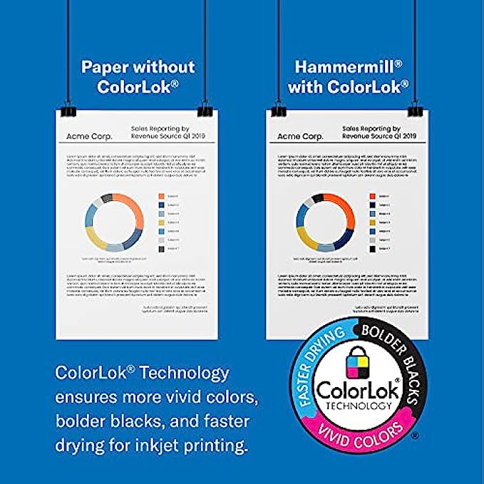 • COLORLOK TECHNOLOGY INCLUDED - Colors on Hammermill copy paper are 30% brighter; blacks are up to 60% bolder and inks dry 3 times faster for less smearing. Acid-free Hammermill paper ensures long-lasting archival quality