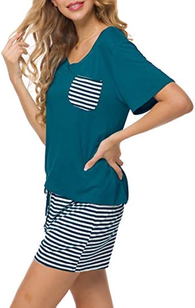 • 2 Elegant and simple styles to choose: 1, Beige trim decor around the neck and the bottom of shorts, solid colors; 2, Solid colored shirt top with real pocket decoration, classic stripes patterned shorts bottom