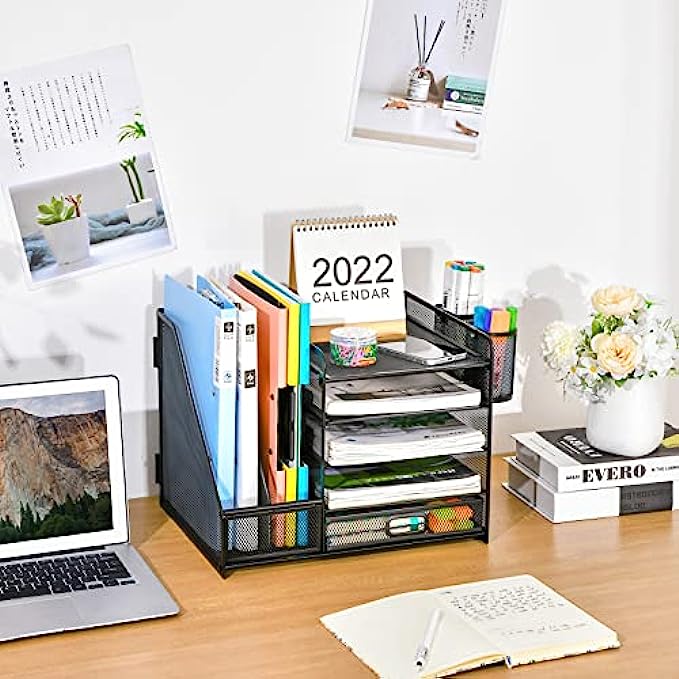 ?【Space Saving】All office document folders would be organized by the vertical file holder. The paper tray organizer is very suitable for storing books, magazines, letters, and A4 paper. The drawer organizer and hanging pen holder enough accommodate all office supply accessories, such as pens, pencils, scissors, and so on. Perfect Size: 13.8*11*12inch.