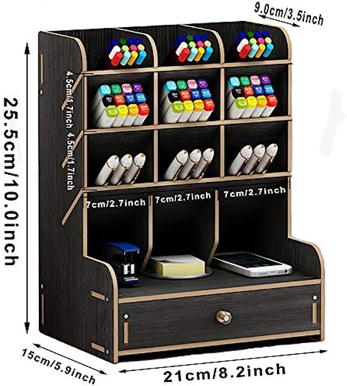 ✎【STAY ORGANIZED】: Set of 12 compartments with a drawer, large capacity ,The desktop organiser shelf is fixed with the screws, which can tightly connect the separate parts. No need for any auxiliary tools, no fiddling around with sachets of glue. Multifunction and help you arrange the desk gadgets and stationary clean and tidy . The best and safest storage option for you. Perfect Size: 8.2*5.9* 10.0inch .
