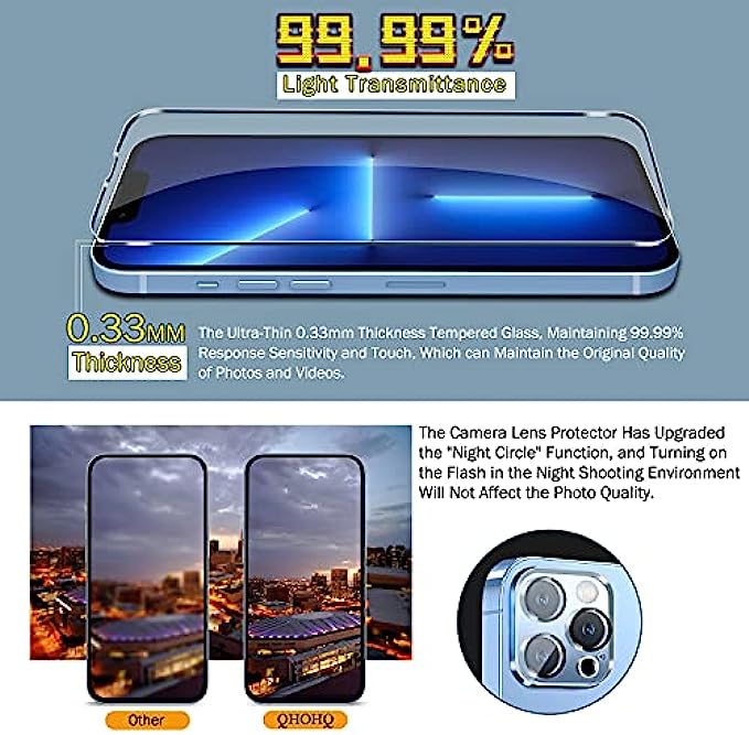 QHOHQ 3 Pack Screen Protector for iPhone 13 Pro Max 6.7 Inch with 3 Pack Tempered Glass Camera Lens Protector, Ultra HD, 9H Hardness, Scratch Resistant, Easy Install - Case Friendly