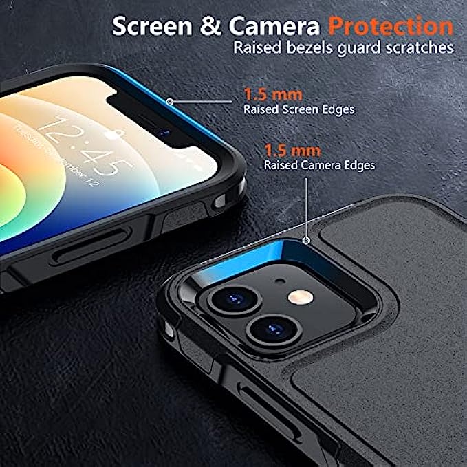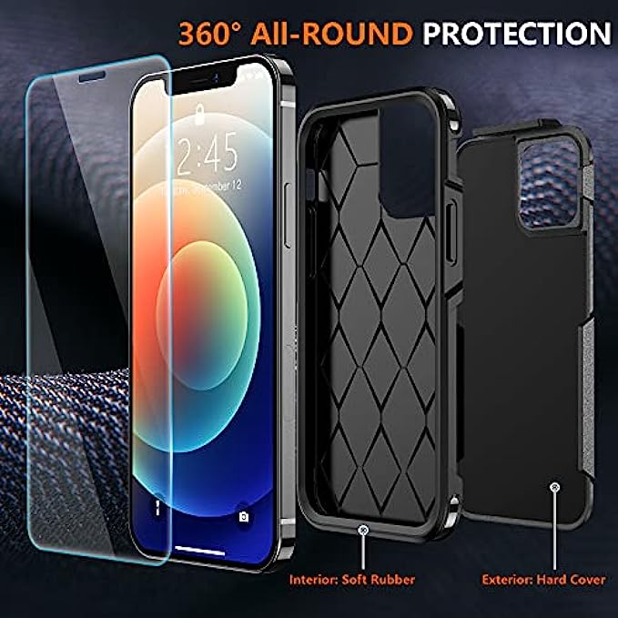 • 【Full Protection】Military Drop Tested. 2-Layer structure provides 360 degree full body rugged protection. The iPhone 12/12 pro case is made with flexible rubber inner cover and hard polycarbonate back cover, provides good shock proofing and anti-drop protection. Attached 2 Tempered Glass with high touch sensitivity prevent scratch.