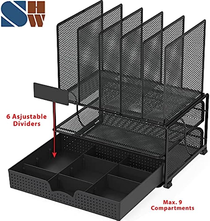 SimpleHouseware Mesh Desk Organizer with Sliding Drawer, Double Tray and 5 Upright Sections, Black