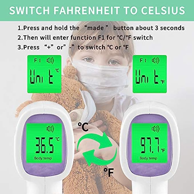 ➤【Friendly Design】The no-touch digital thermometer has a non-slip design, and the LCD display is clear and easy to read, the display can be used at night without in light. The thermometer is equipped with an internal memory that can store up to 40 sets of data readings that allows you to keep track of the historical temperature changes for you and your family.