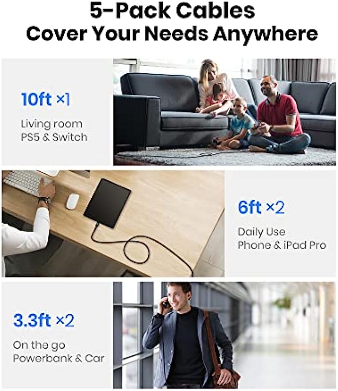 ✅【One package, 5 Fast Charging Cables】 The real one-stop cable solution, with two 3.3fts, two 6fts and one 10ft, you’ll wonder why you bother to buy any extra cables. Share them with your family or friends or simply put them anywhere you want to stay powered. They’ve got your needs all covered.
