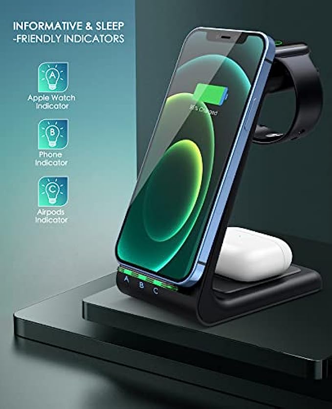 • 【3-in-1 Wireless Charging Station】 You can charge your apple products simultaneously through this 3-in-1 iphone charging station. It charges your iPhone, Apple Watch, and AirPods at the same time. Powered by the included 18W QC 3.0 adapter, the wireless charging stand outputs up to 10W for Phones, 5W for AirPods 2 (wireless case)/Pro, and 3W for Apple Watch.
