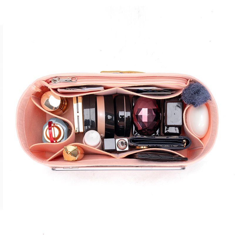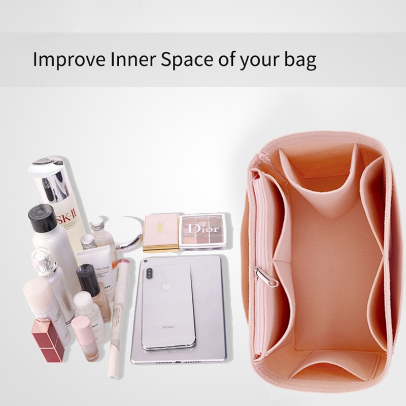 Colour:pink and grey Material Quality:felt Fits nicely in my Longchamp short handle bag. Slightly shorter than my previous bag organizer but more spacious. Can fit a cup of water as shown in the last photo