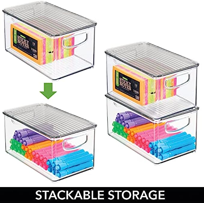PORTABLE & LID: Create space-saving storage in closets, shelves, cabinets, cupboards or on your work surface; Portable to move from room-to-room; Clear view so you can easily find what you are looking for without opening the bins; Keep items contained, organized and dust-free; Perfect for storing extra office supplies like staples, highlighters, paper clips, binder clips, staplers, notepads, sticky notes, washi tape, glue sticks, rubber cement and more; Set of 4