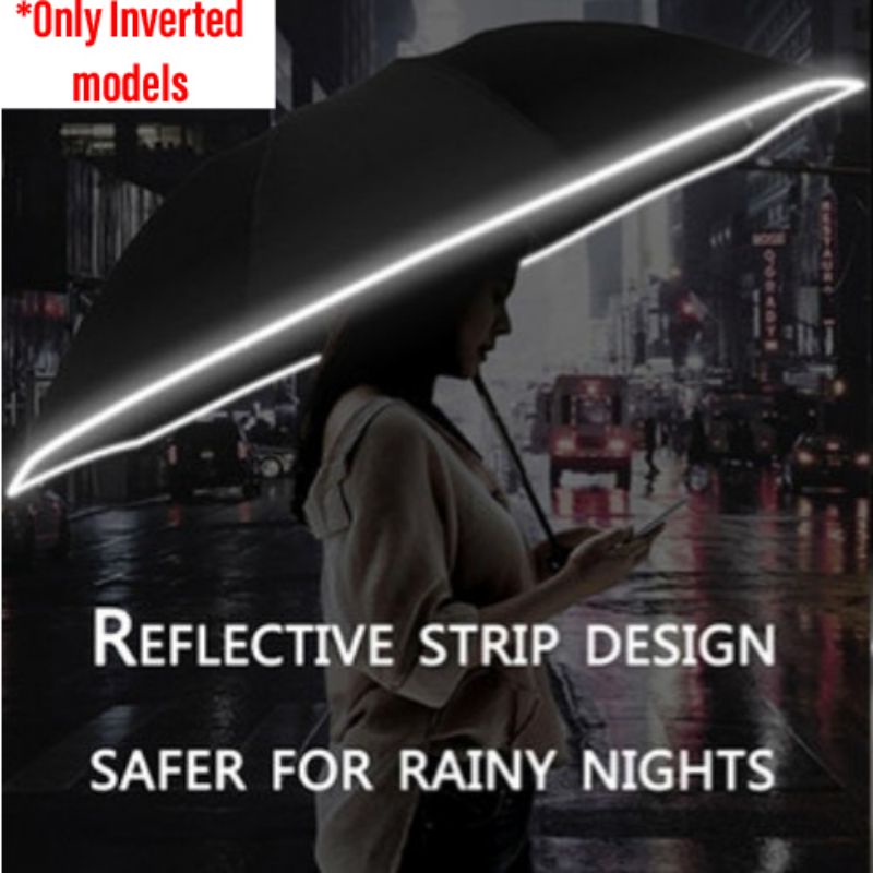 I like automatic. Nice small, colorful orange, thick UV umbrella. Length 28.5cm folded. Umbrella coverage diameter about 95cm. The Inverted umbrella is good for driver. length 34cm folded. Umbrella coverage diameter about 105cm.